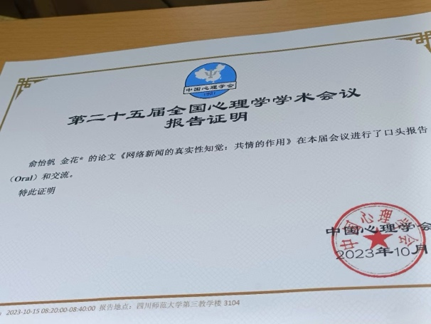 四年来,我积极参与各类科研项目,深入探索学术前沿,取得了一定的研究成果。在本科学习期间,我以第一作者身份发表了 1 篇 SSCI 论文,以其他作者身份参与发表了 2 篇核心论文,目前还有 1 篇论文正在投稿中。2023 年,我有幸在四川师范大学参加了第二十五届全国心理学学术会议,并进行了口头汇报,会议摘要已被知网收录。此外,我还有幸参加了在上海举办的中国心理学会发展心理专业委员会第二届学术年会,与众多专家学者交流学习,拓宽了学术视野。