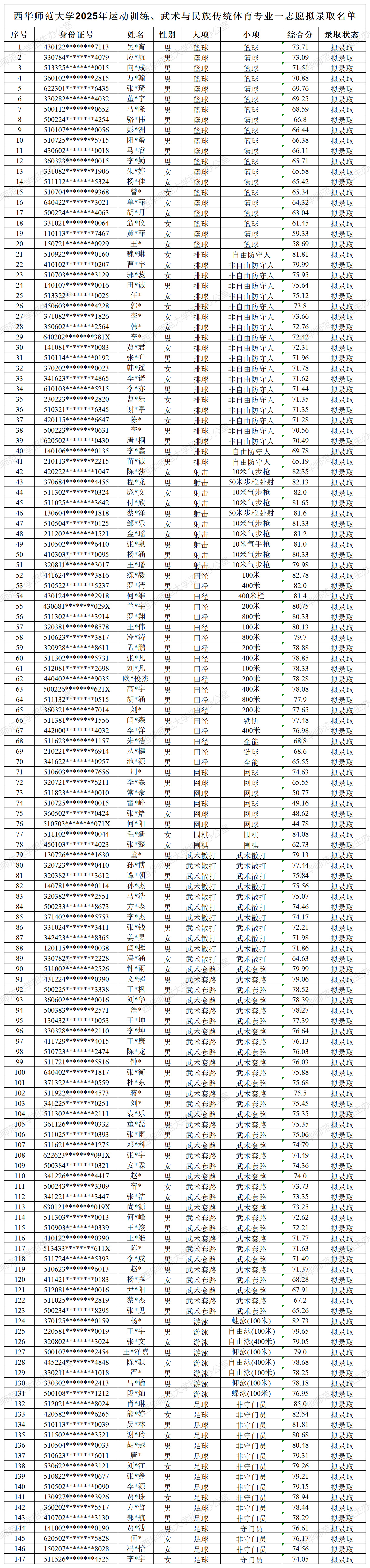 根据《体育总局办公厅、教育部办公厅关于印发<2025年普通高等学校运动训练、武术与民族传统体育专业招生管理办法>的通知》(体科字〔2024〕256号)(以下简称“通知”)、《西华师范大学2025年运动训练、武术与民族传统体育专业招生简章》(以下简称“简章”)等相关文件要求,经学校全日制本专科招生录取工作领导小组审议通过,现将西华师范大学2025年运动训练、武术与民族传统体育专业一志愿拟录取名单及相关事项公示如下: