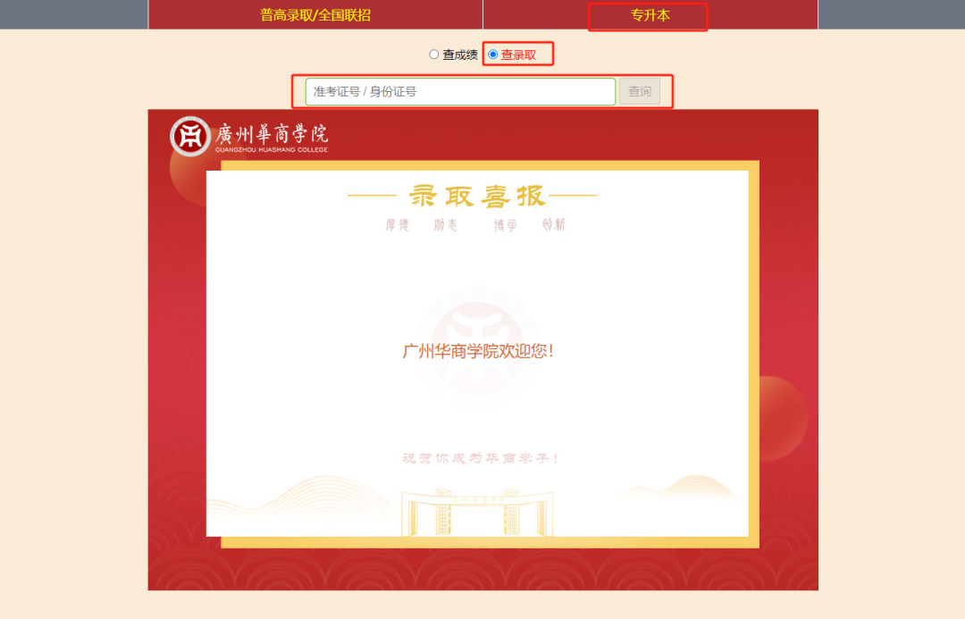 查询网站:广州华商学院招生信息网(http://zs.gdhsc.edu.cn/)