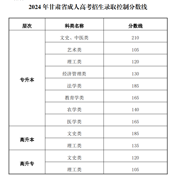 2024年甘肃省成人高考招生录取控制分数线