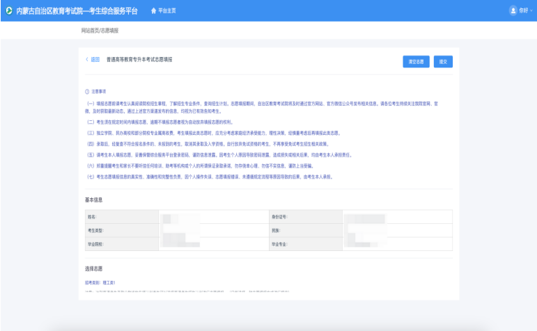 (二)考生本人登录内蒙古自治区教育考试院“考生综合服务平台”(https://www4.nm.zsks.cn/BaseStudent/),选择“普通高等教育专升本”,点击“志愿填报”,按照系统所显示的对应关系填报志愿。