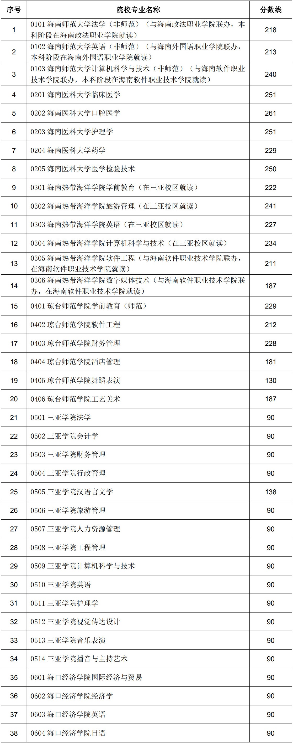 2025年海南省普通高校专升本招生录取最低控制分数线