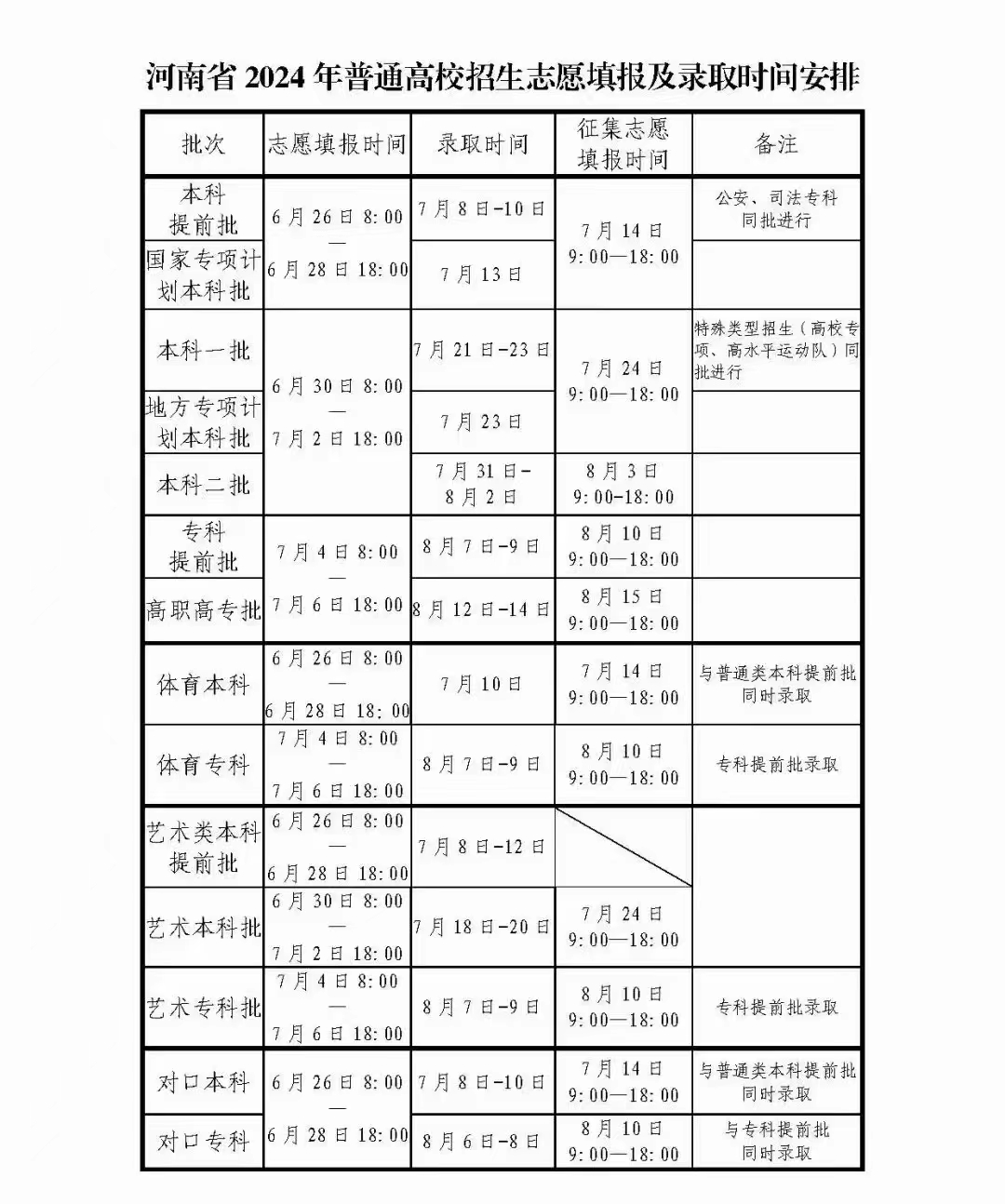河南省2024年普通高校招生志愿填报及录取时间安排
