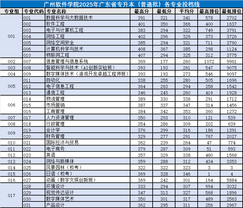 2025年新增专业:软件工程最低分350、最高分401;网络空间安全最低分294、最高分385。