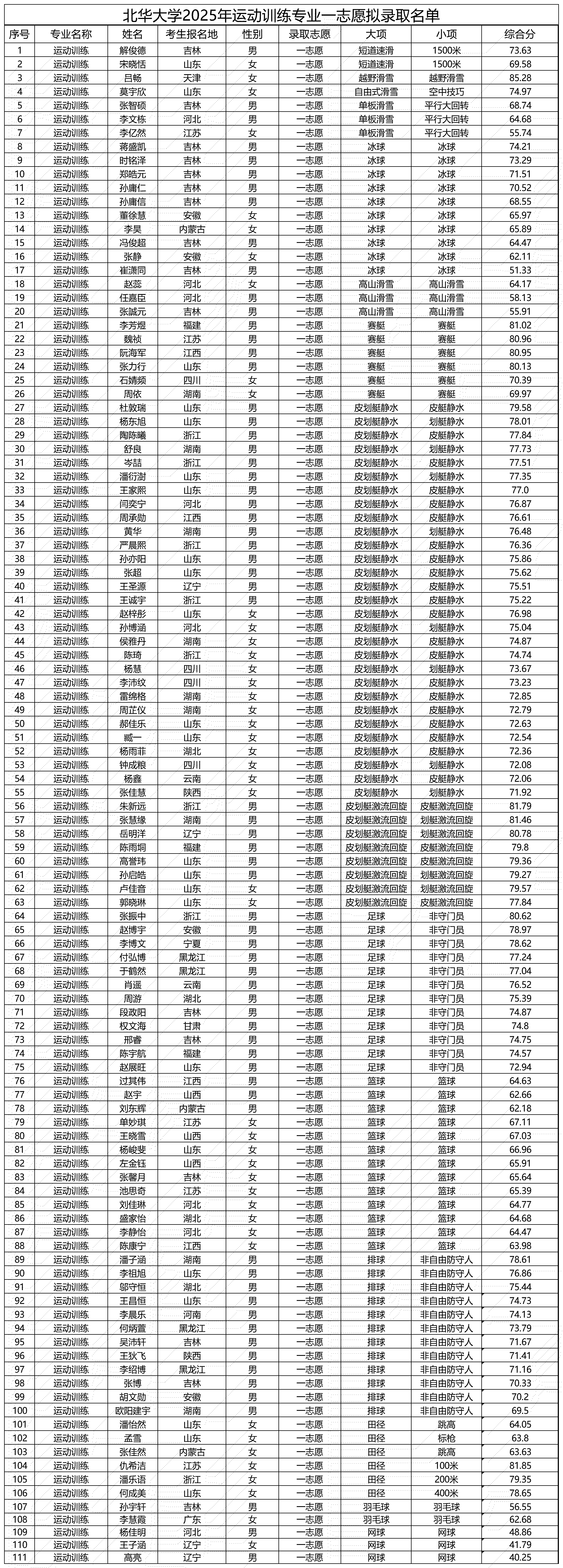北华大学2025年运动训练专业(一志愿)拟录取工作已初步完成,现就拟录取名单予以公示。