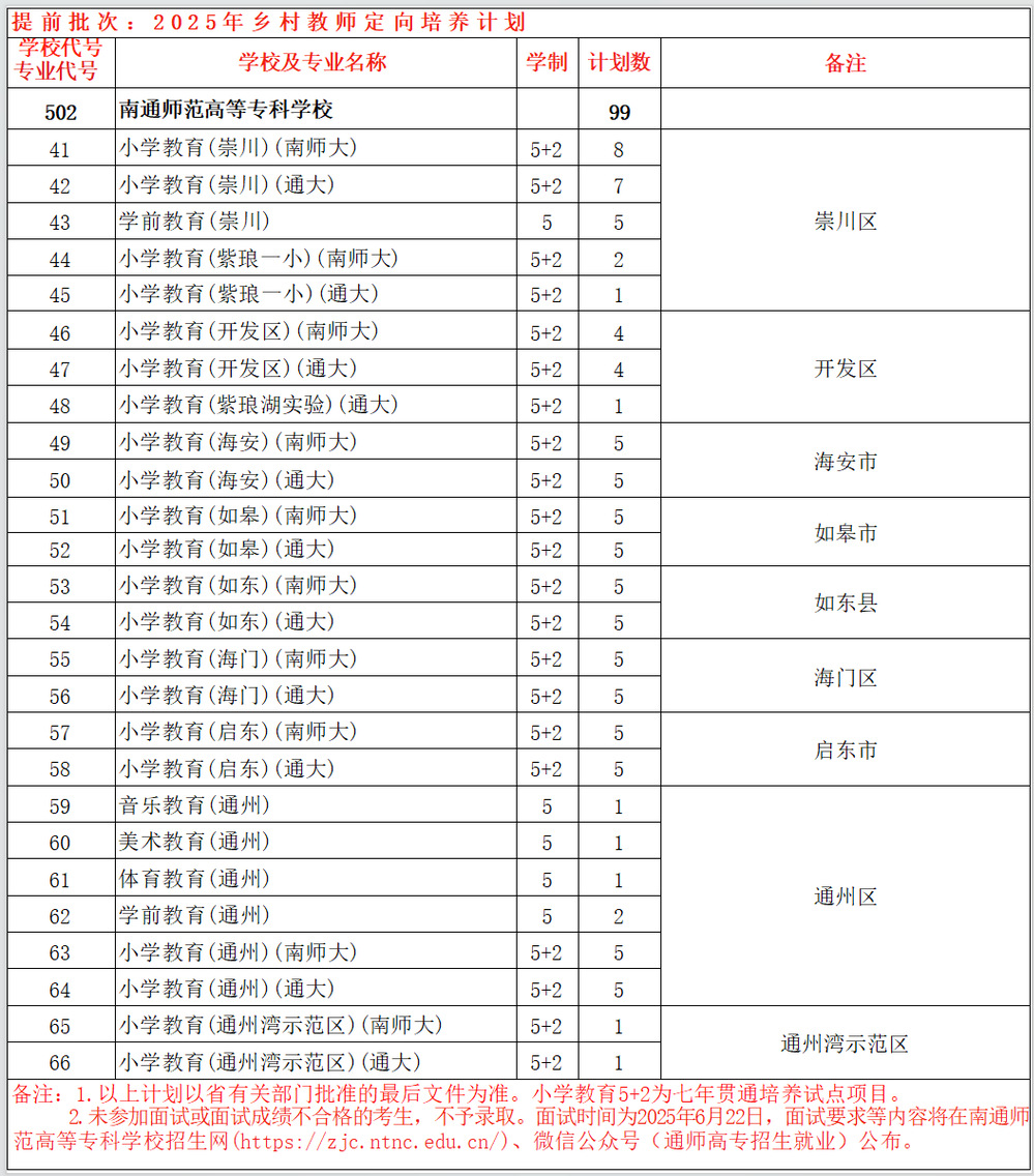 4.面试时间为2025年6月22日,面试地点为南通师范高等专科学校开发区校区,面试要求等内容将在南通师范高等专科学校招生网(https://zjc.ntnc.edu.cn/)、微信公众号(通师高专招生就业)公布。