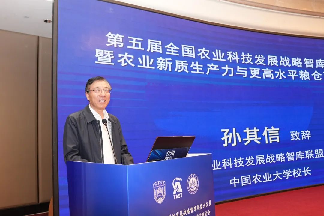 孙其信在讲话时代表智库联盟和中国农业大学向会议的举办表示祝贺,对出席会议的各位领导、专家表示欢迎和感谢。他说,当前,世界百年未有之大变局正在加速演进和纵深发展,其方向与力度事关中华民族伟大复兴战略全局。在推进中华民族伟大复兴的历史进程中,必须要实现的一项基本任务就是建成农业强国。而促进高水平农业科技自立自强、全方位夯实粮食安全根基、发展农业新质生产力是加快建设农业强国的重要抓手,也是支撑中国式现代化建设的关键之举。孙其信表示,战略研判、战略部署、战略设计在推动实现农业强国建设等方面发挥着不可替代的重大作用,希望战略联盟继续发挥资源优势、深化交流合作,加大科技投入、加强改革创新,培养更多具有战略思维、战略水平、战略技能的年轻人,为加快建设高水平粮仓、推进中国式现代化建设作出新的更大贡献。