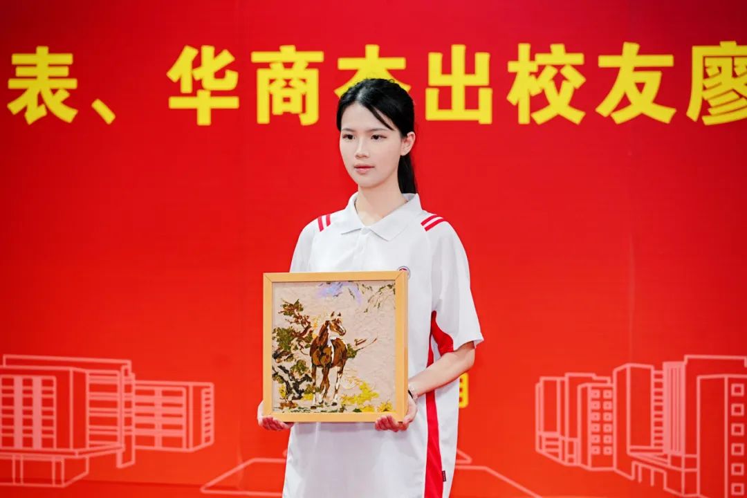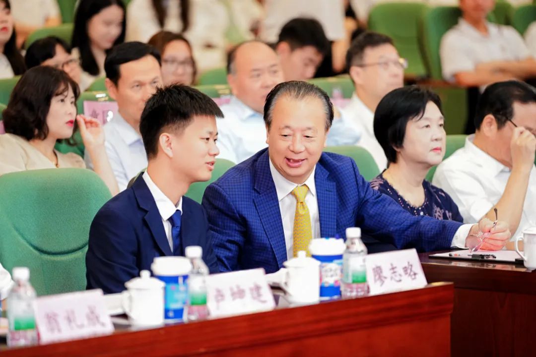 在热烈掌声中,华商科教集团董事长廖榕就及夫人陈练瑛为廖志略颁发“廖榕就 陈练瑛伉俪华商英才奖章”。这一奖章不仅是对廖志略卓越成就的认可,更是对他对母校深情厚谊的嘉奖。学生代表为廖志略献上了鲜花,表达了对他的敬仰之情。