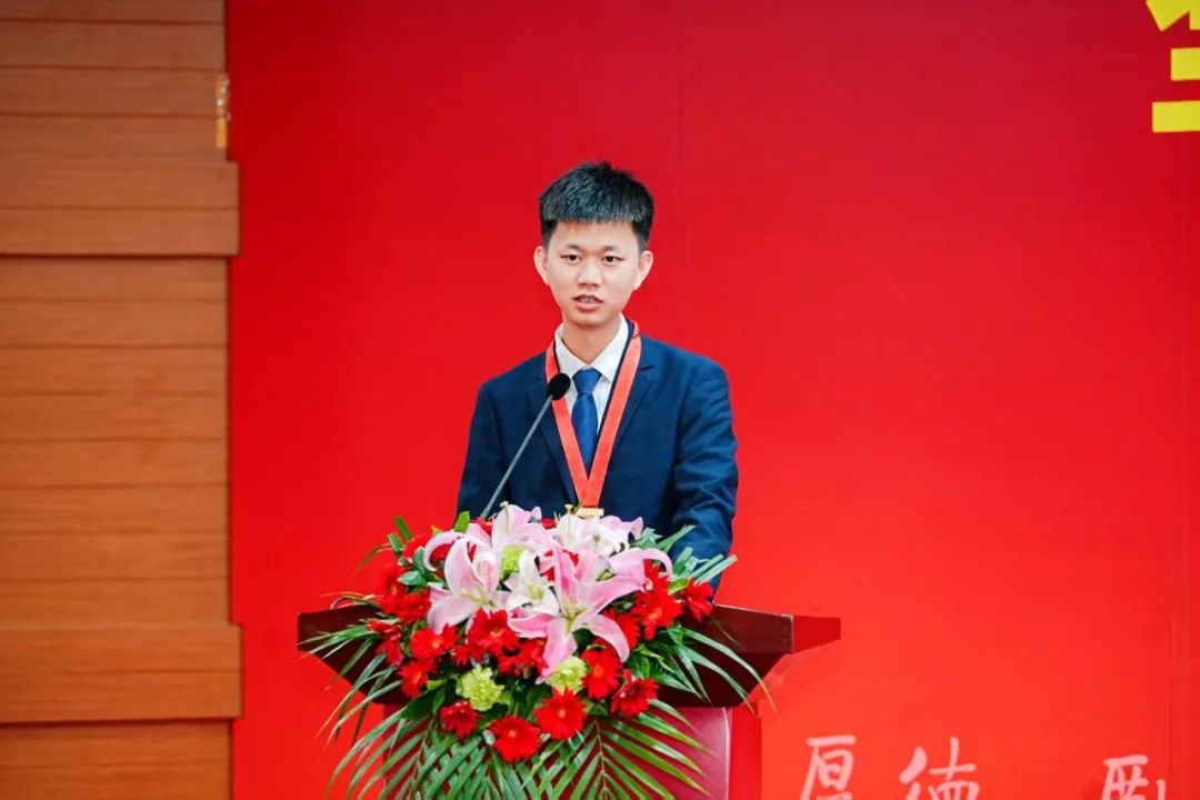 在校生代表廖达鑫发言,他表达了对廖志略师兄的崇高敬意,用“选择、创造、担当”三个关键词分享了廖志略师兄对他的启示,并号召同学们以师兄为榜样,将职业技能化作服务社会的利器,绽放青春光彩。