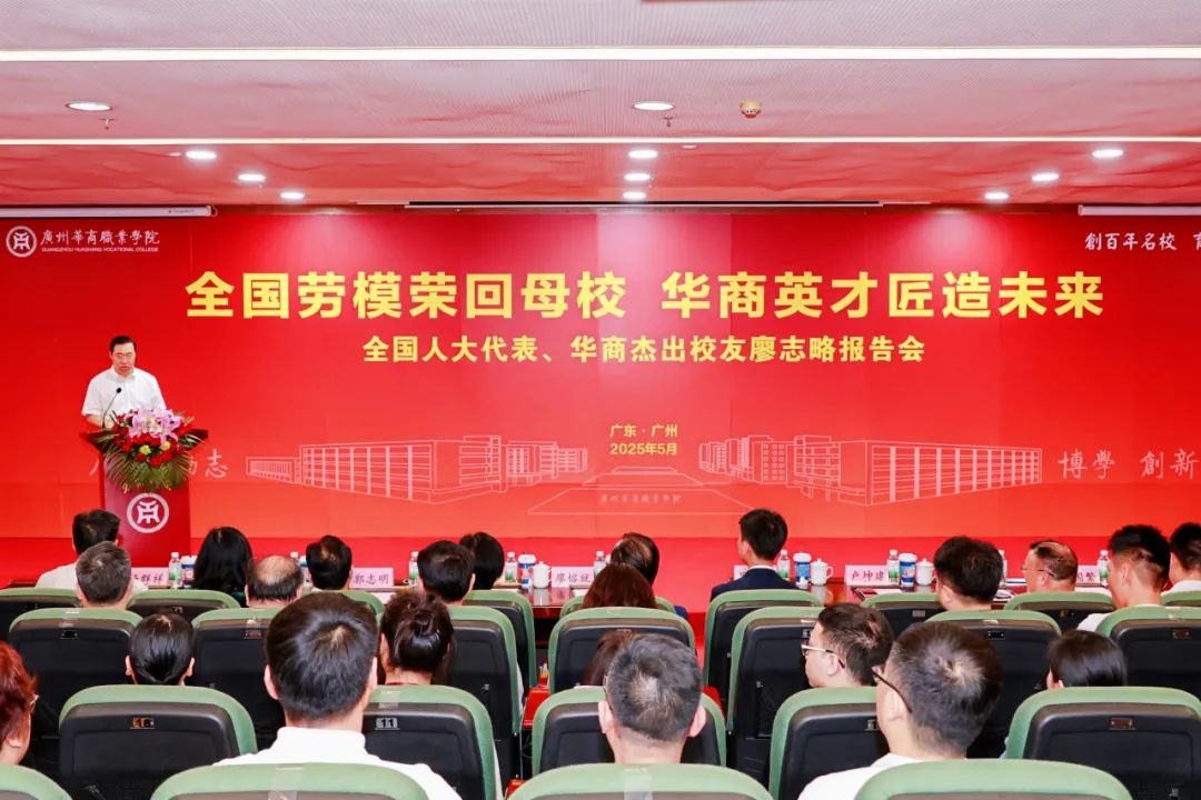 廖榕就董事长寄语:尊敬的廖志略校友,各位老师、同学们:今天,我们怀着无比喜悦和激动的心情,在华商校园,隆重举行全国五一劳动模范、杰出校友廖志略荣返母校报告会,这不仅是一次荣耀的相聚,更是一场华商学子以奋斗书写时代答卷的精神盛宴!在此,我向志略校友致以崇高的敬意和诚挚的祝贺!祝贺你从全国人大代表到“全国劳动模范”的双重加冕!你以职教生的身份登上国家荣誉之巅,向世人证明了:职业教育,是成就人生的星光大道;技能报国,是时代赋予青年的壮丽征程;华商职院,是培育强国人才的沃土和摇篮!