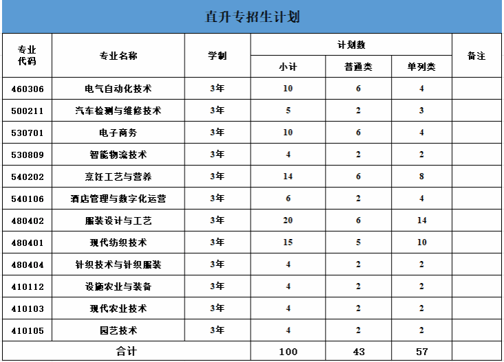 今年学院直升专计划 100 人,其中:普通类 43 人,单列类 57 人。分专业招生计划如下表: