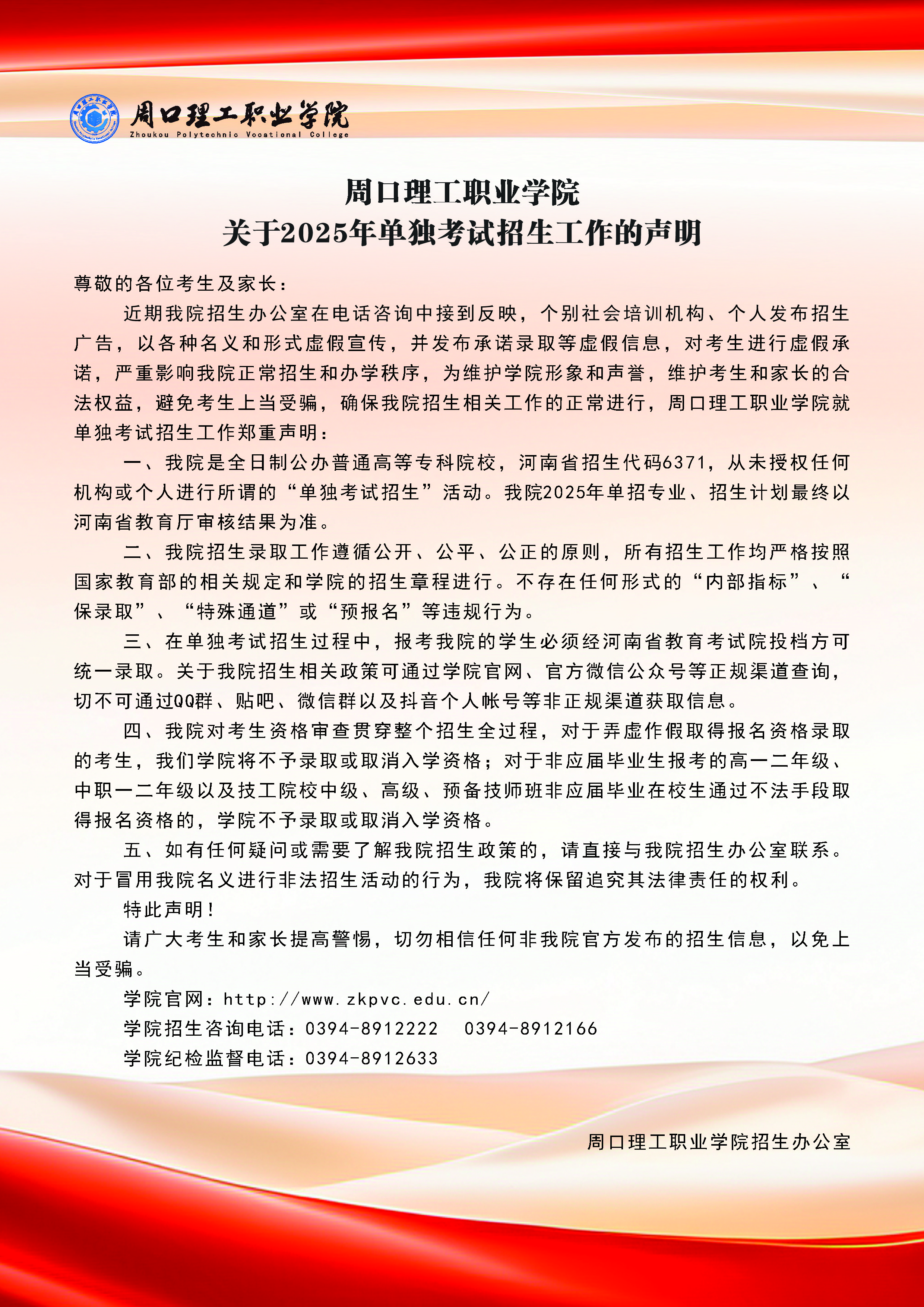 周口理工职业学院 关于2025年单独考试招生工作的声明