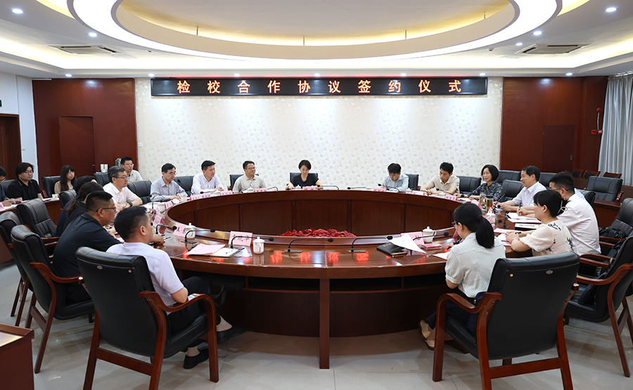 陈桂林代表学校致欢迎辞,介绍了学校建设发展的基本情况。周旭与李玉科代表校检双方签署了检校合作协议。