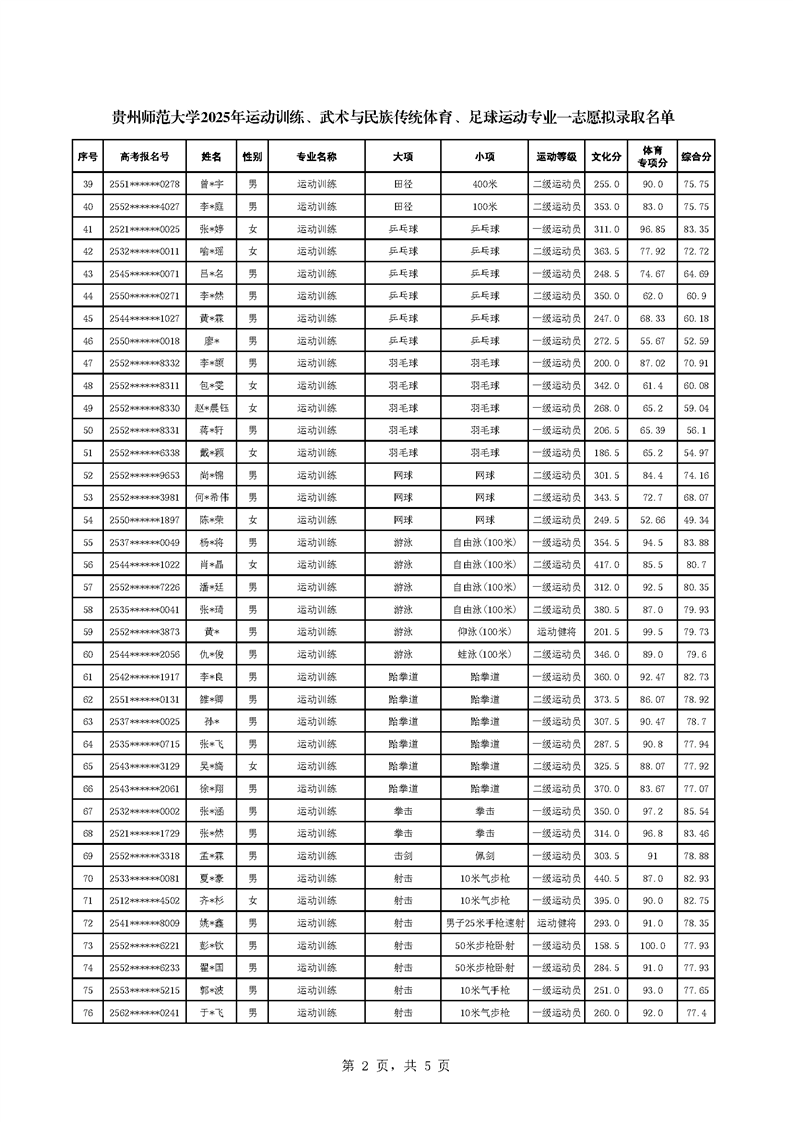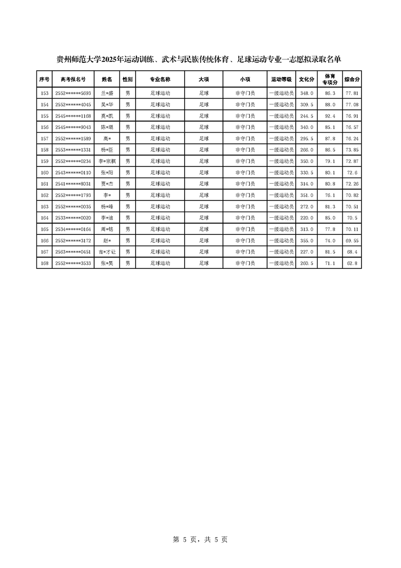根据教育部、国家体育总局《2025年普通高校运动训练、武术与民族传统体育专业招生管理办法》(体科字〔2024〕256号)、《贵州师范大学2025年运动训练、武术与民族传统体育、足球运动专业招生简章》等相关文件要求,现将贵州师范大学运动训练、武术与民族传统体育、足球运动专业一志愿拟录取名单进行公示,正式录取名单以教育部、国家体育总局、各省招生部门审核通过为准。