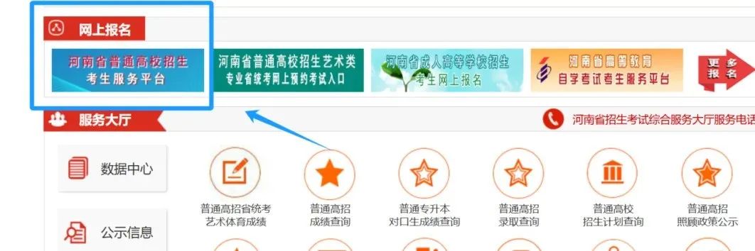 第二步,在网站首页找到并点击进入“河南省普通高校招生考生服务平台”输入考生“个人信息”