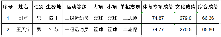 根据《体育总局办公厅教育部办公厅关于印发2025年普通高等学校运动训练、武术与民族传统体育专业招生管理办法的通知》(体科字〔2024〕256号)和《重庆文理学院2025年运动训练专业招生简章》等文件要求,确定2025年运动训练专业二志愿拟录取考生2人,现将拟录取名单予以公示,具体名单如下:
