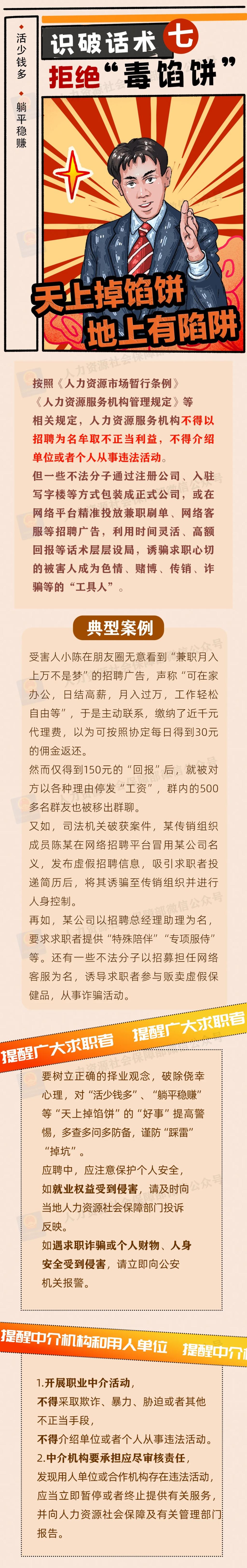 为加强风险防范,人力资源社会保障部、中央网信办、 教育部联合发布招聘欺诈典型案例,揭示不法分子的惯用手法和话术套路,帮助高校毕业生等广大求职者提高风险识别意识,增强自我保护能力。