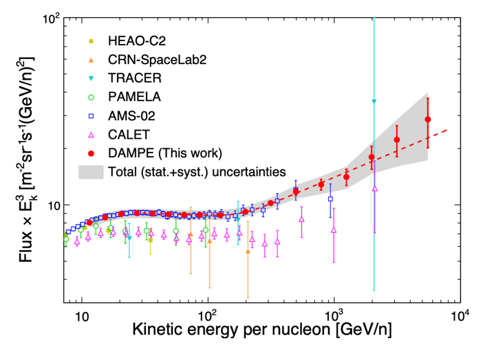 这项成果由我校与紫金山天文台、格兰萨索科学研究所、日内瓦大学联合完成。物理学院黄光顺教授、张云龙教授、魏逸丰副教授团队在该分析工作中做出了重要贡献。科大团队是DAMPE国际合作组内的平行分析团队,在魏逸丰副教授具体指导下,博士生徐恩珩独立研究了硼元素的粒子鉴别、效率估计、本底估计等一系列关键问题,完成了对硼能谱的分析工作。