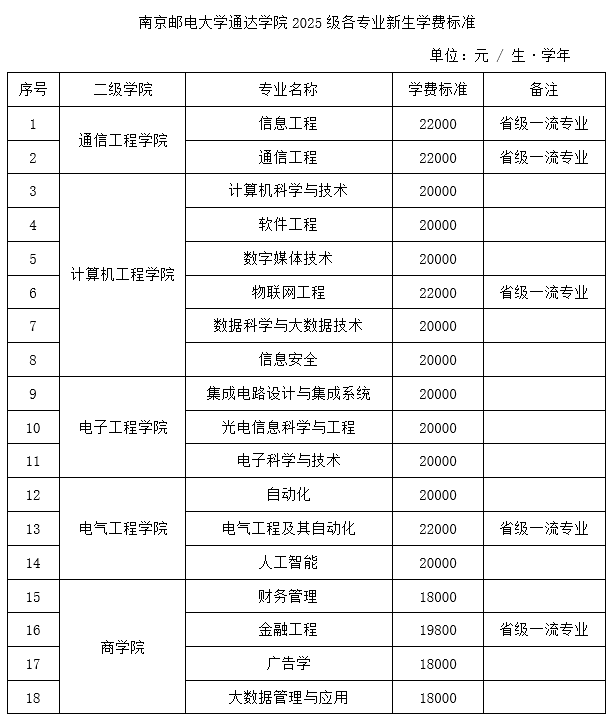 七、收费项目及标准:根据《省发展改革委 省教育厅关于优化民办高校收费管理有关事项的通知》(苏发改收费发〔2023〕677号)文件精神,各专业学费收取标准如下表所示。我院实行学分制收费,下表为各专业预收标准。根据《江苏省物价局 江苏省财政厅 江苏省教育厅关于高等学校社会化学生公寓收费管理暂行办法》(苏价费〔2002〕369号、苏财综〔2002〕162号)文件精神,住宿费收取标准为每生每年1200或1500元。