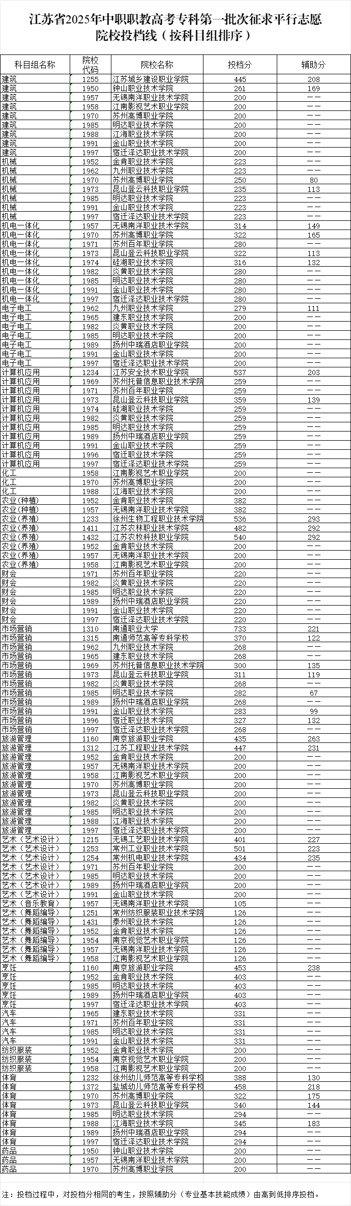 江苏省2025年中职职教高考专科第一批次征求平行志愿院校投档线(按科目组排序)