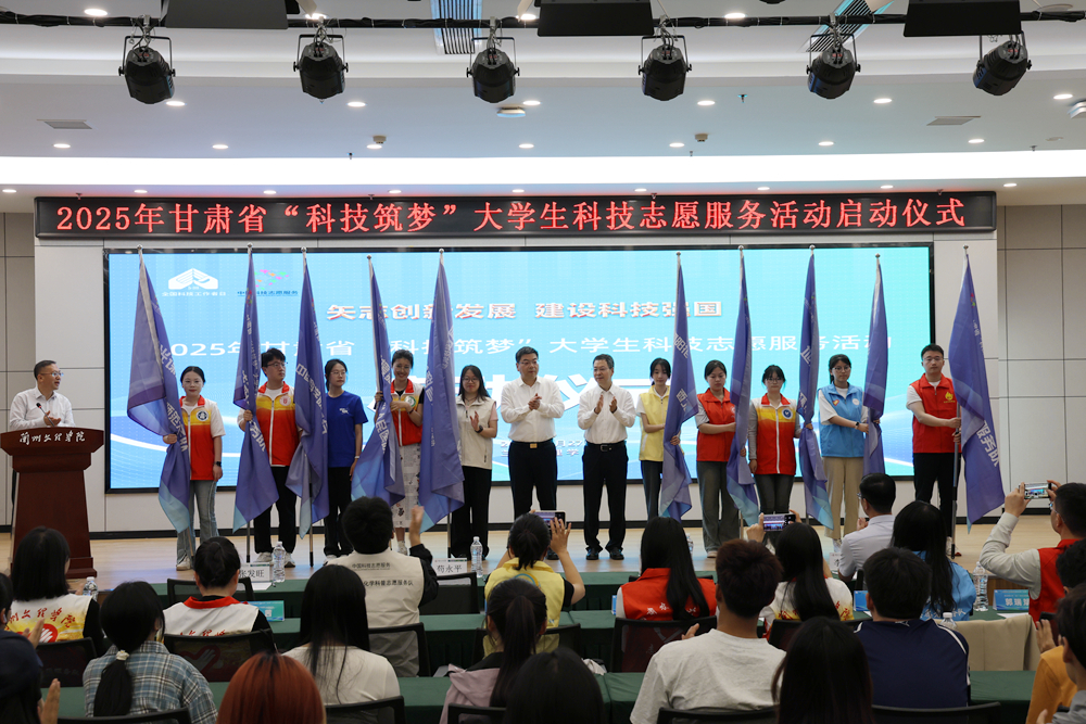 包俊宗和苟永平共同为兰州文理学院雁青科技志愿服务队、西北师范大学微光课堂志愿服务队、甘肃省人民医院护理援藏行志愿服务队等15支大学生科技志愿者服务队授旗。