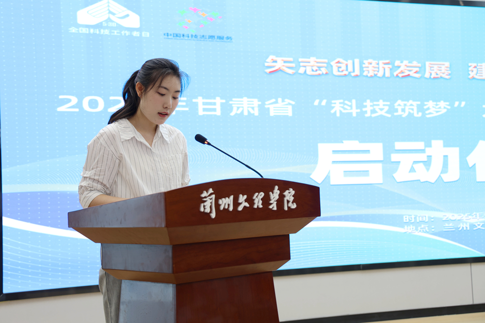 我校雁青科技志愿服务队成员、文学院2022级非遗保护专业范佳昕同学代表志愿者发言,承诺将以饱满的服务热情、扎实的专业知识和科技报国的坚定决心为甘肃省的科技发展贡献力量。