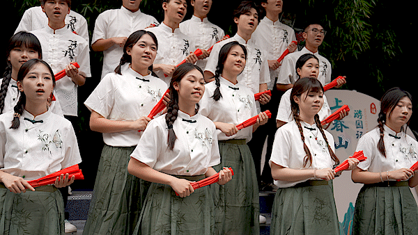 移步鹤鸣楼,时尚设计学院以激昂歌声向祖国深情“告白”:“我爱你中国,亲爱的母亲,我为你流泪也为你感到自豪……”和着特邀小嘉宾纯净稚嫩的童音,唱出了对祖国最真挚的爱意。