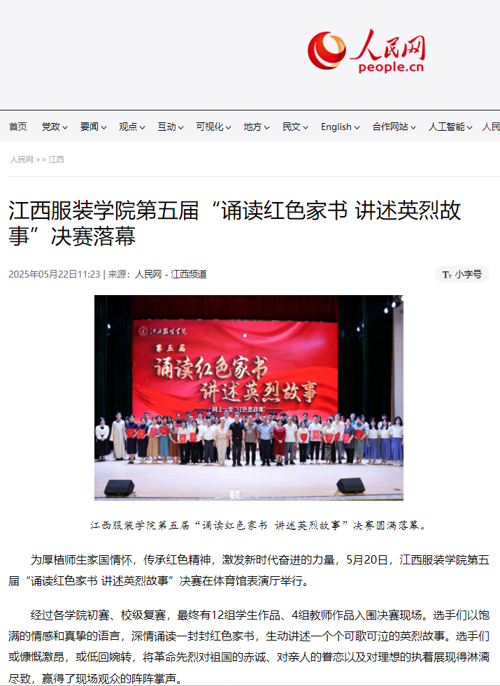为厚植师生家国情怀,传承红色精神,激发新时代奋进的力量,5月20日,江西服装学院第五届“诵读红色家书 讲述英烈故事”决赛在体育馆表演厅举行。校党委副书记唐新强、党委组织部部长陈翠娥、党委宣传部部长沈新建、党委学工部部长邓良峰、党委保卫部部长鲍鹏,以及各学院党委(党总支)书记,思政课教师、辅导员、入党积极分子代表等400余名师生现场观摩了演出,近三千名师生通过视频号线上观看了现场直播。