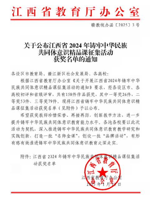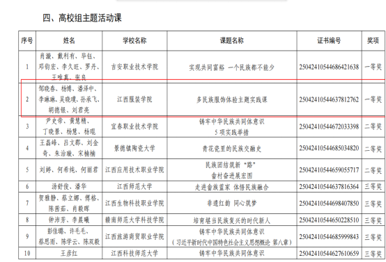 新闻中心讯(供稿/党委统战部)近日,江西省教育厅公布了2024年铸牢中华民族共同体意识精品课征集活动的获奖名单,我校邹晓春教授带领的团队申报的《多民族服饰体验主题实践课》荣获高校组主题活动课一等奖,这一荣誉充分展现了我校在铸牢中华民族共同体意识教育方面的实践成果和育人成效。