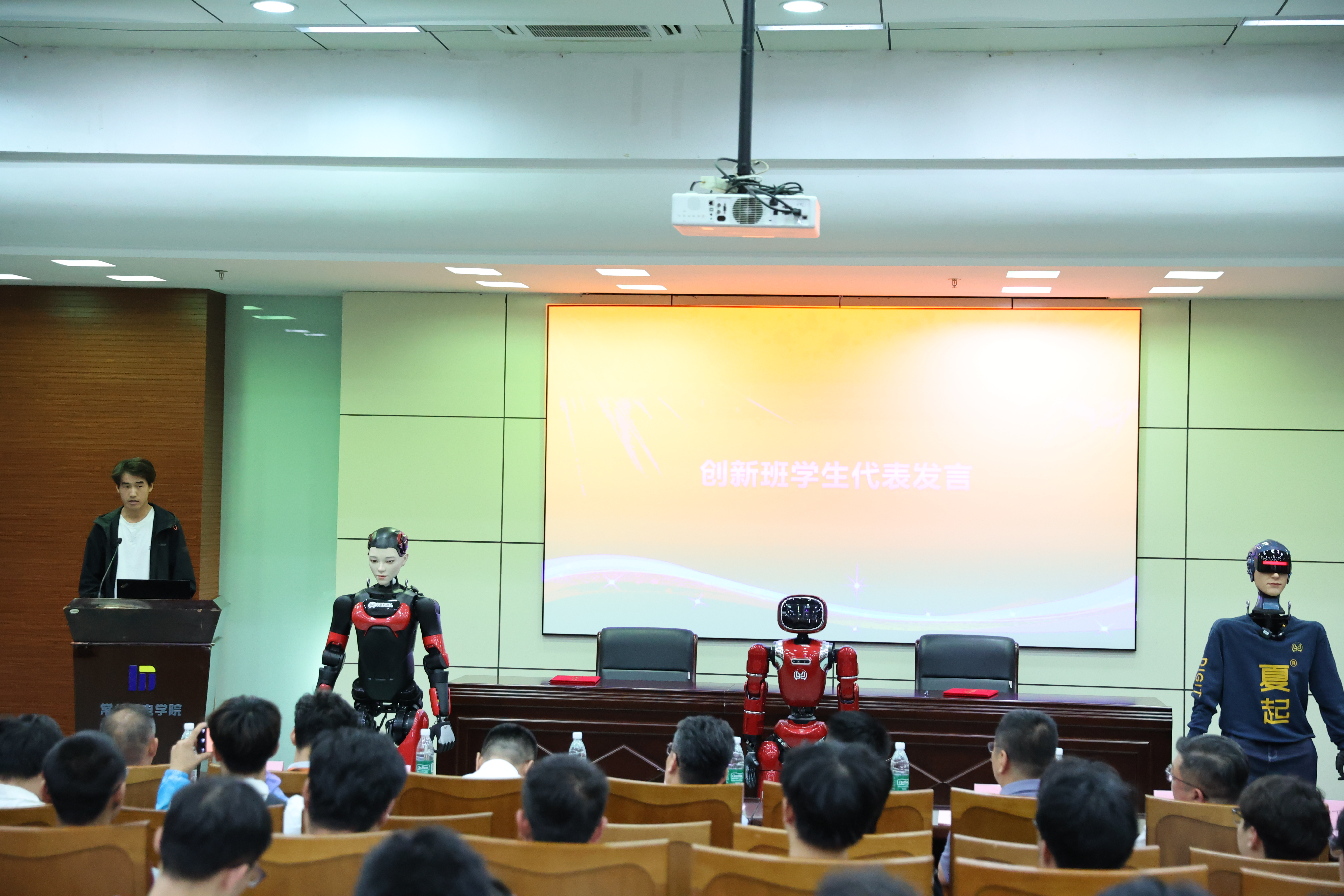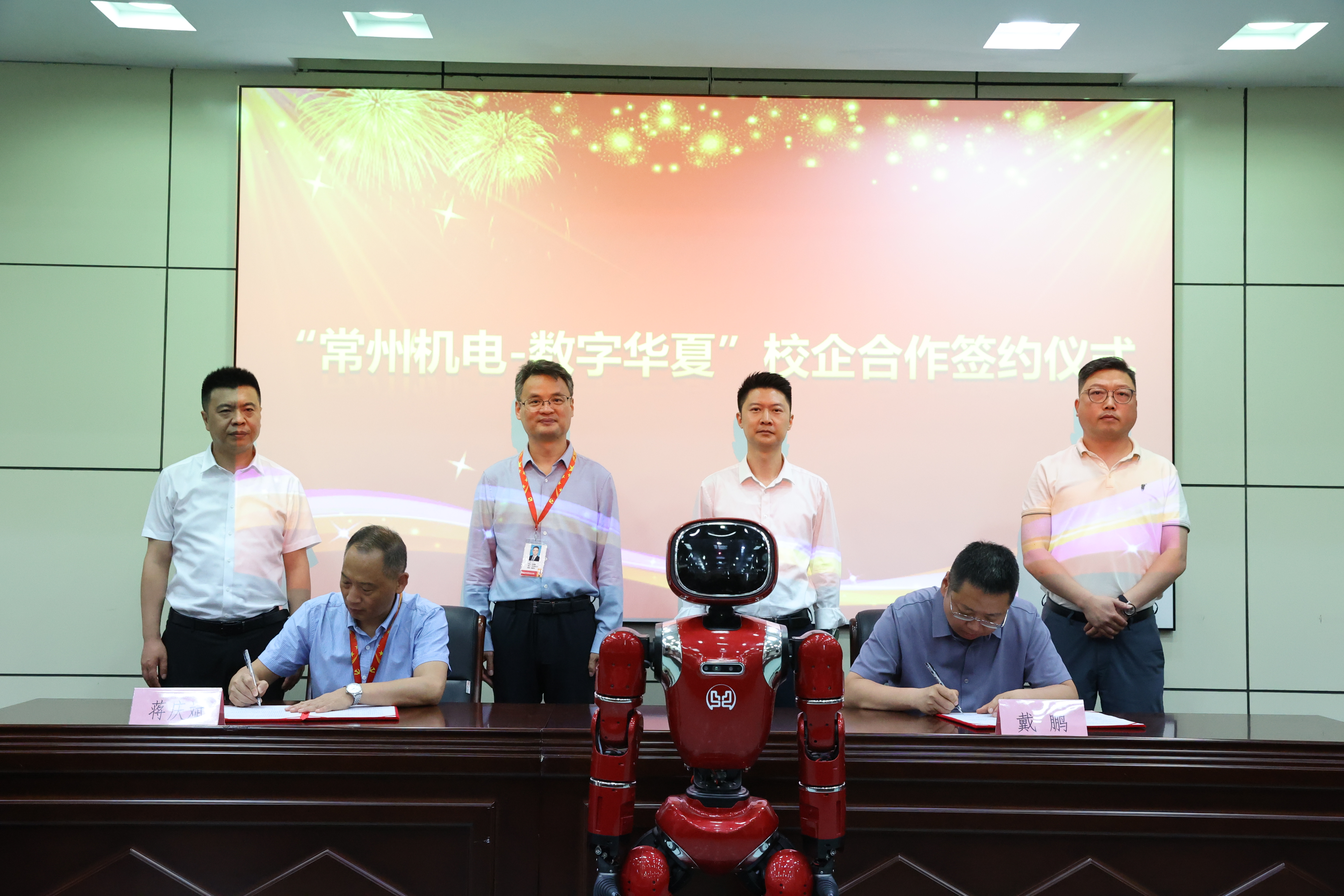 数字华夏创始人、CEO沈健,总经理戴鹏等企业代表,我校副校长刘贤锋出席,产教部、电气工程学院等部门负责人及机器人创新班全体学生参加了仪式。