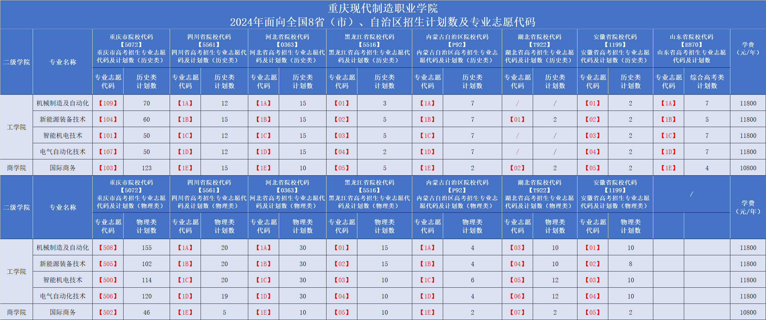 重庆现代制造职业学院2024年面向全国8省(市)、自治区招生计划数及专业志愿代码