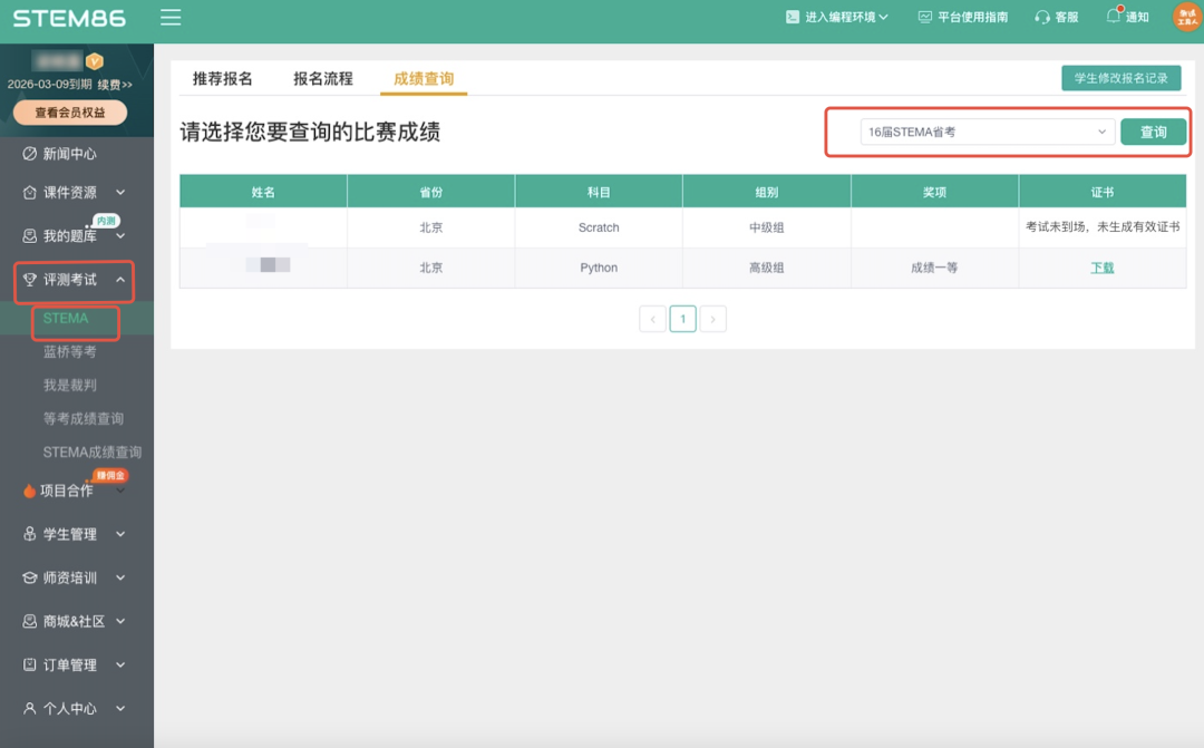 2、点击左侧导航,【评测考试】-【STEMA】-【成绩查询】,右上角可切换考试日期,或直接点击【STEMA成绩查询】查询即可。