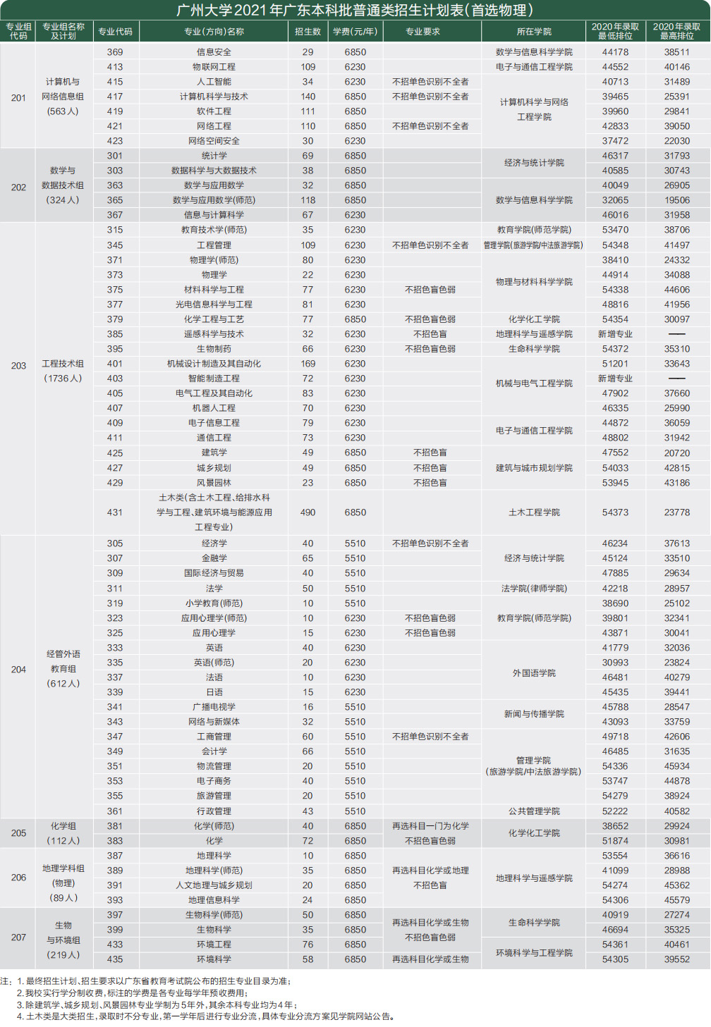 2021年广东本科批普通类招生计划表(首选物理)