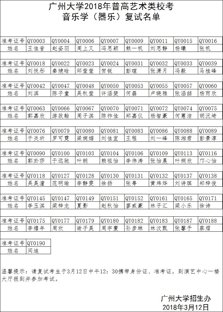 复试名单4|广州大学2018年普高艺术类校考音乐学(器乐)复试名单公告