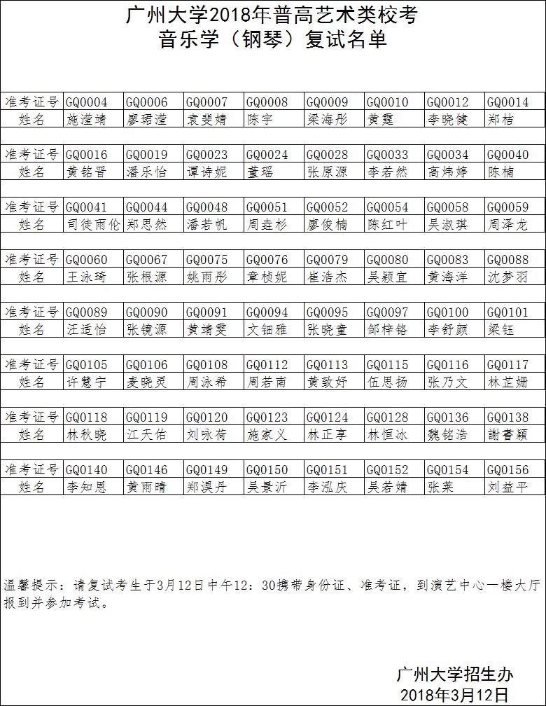 复试名单5|广州大学2018年普高艺术类校考音乐学(钢琴)复试名单公告