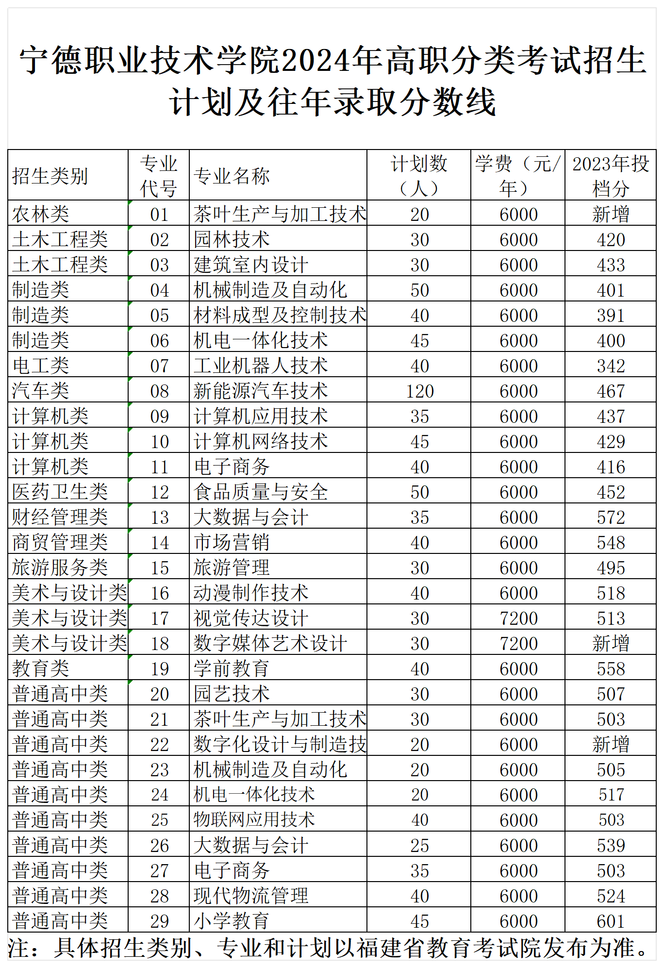 宁德职业技术学院2024年高职分类考试招生计划及往年录取分数线