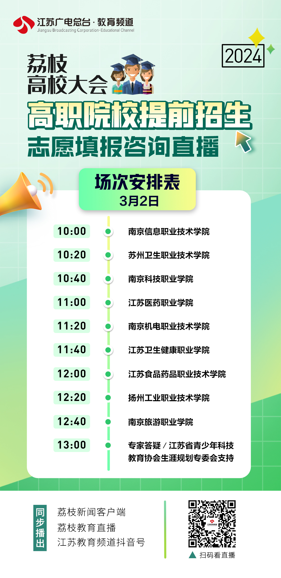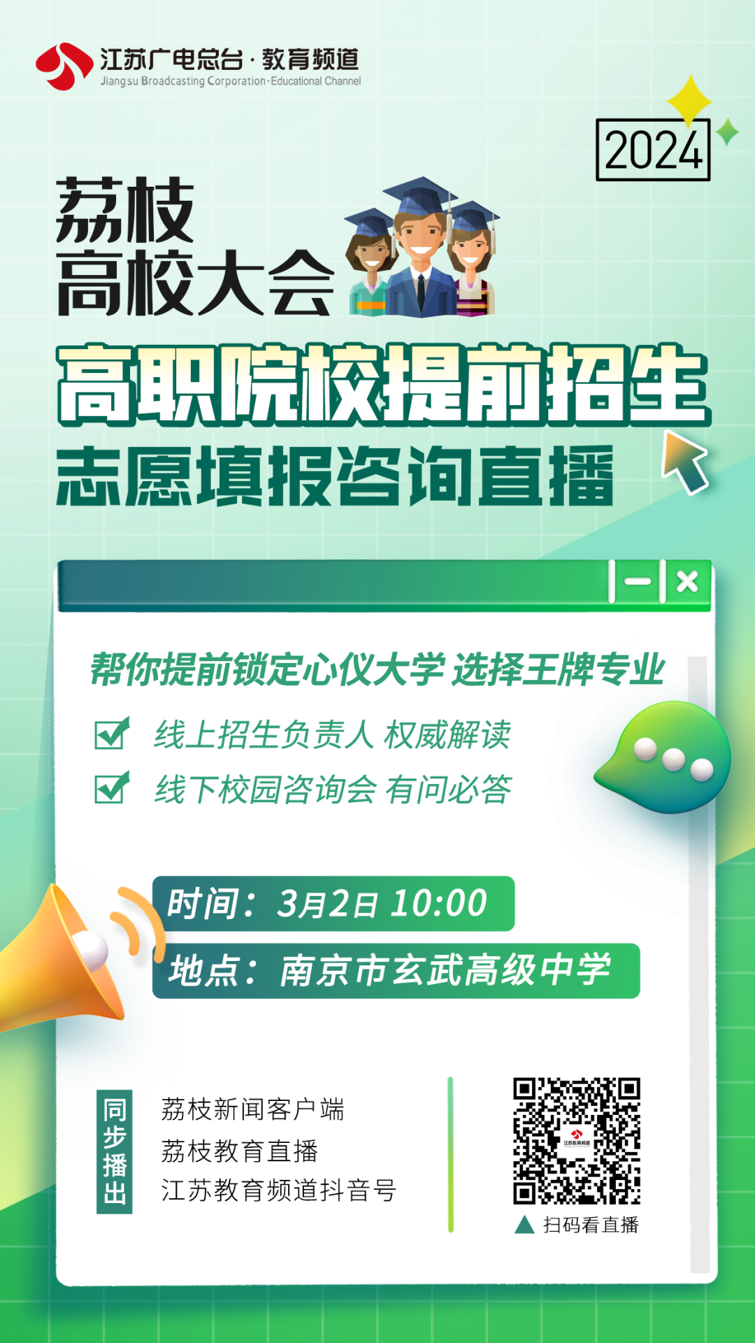 帮你提前选大学!作为首场主打活动,3月2日10:00,“2024荔枝高校大会•高职院校提前招生”志愿填报咨询直播开启,助力考生提前锁定心仪大学,选择王牌专业。荔枝新闻、荔枝教育直播、江苏教育频道抖音号等平台同步播出,@2024高三考生,千万别错过!