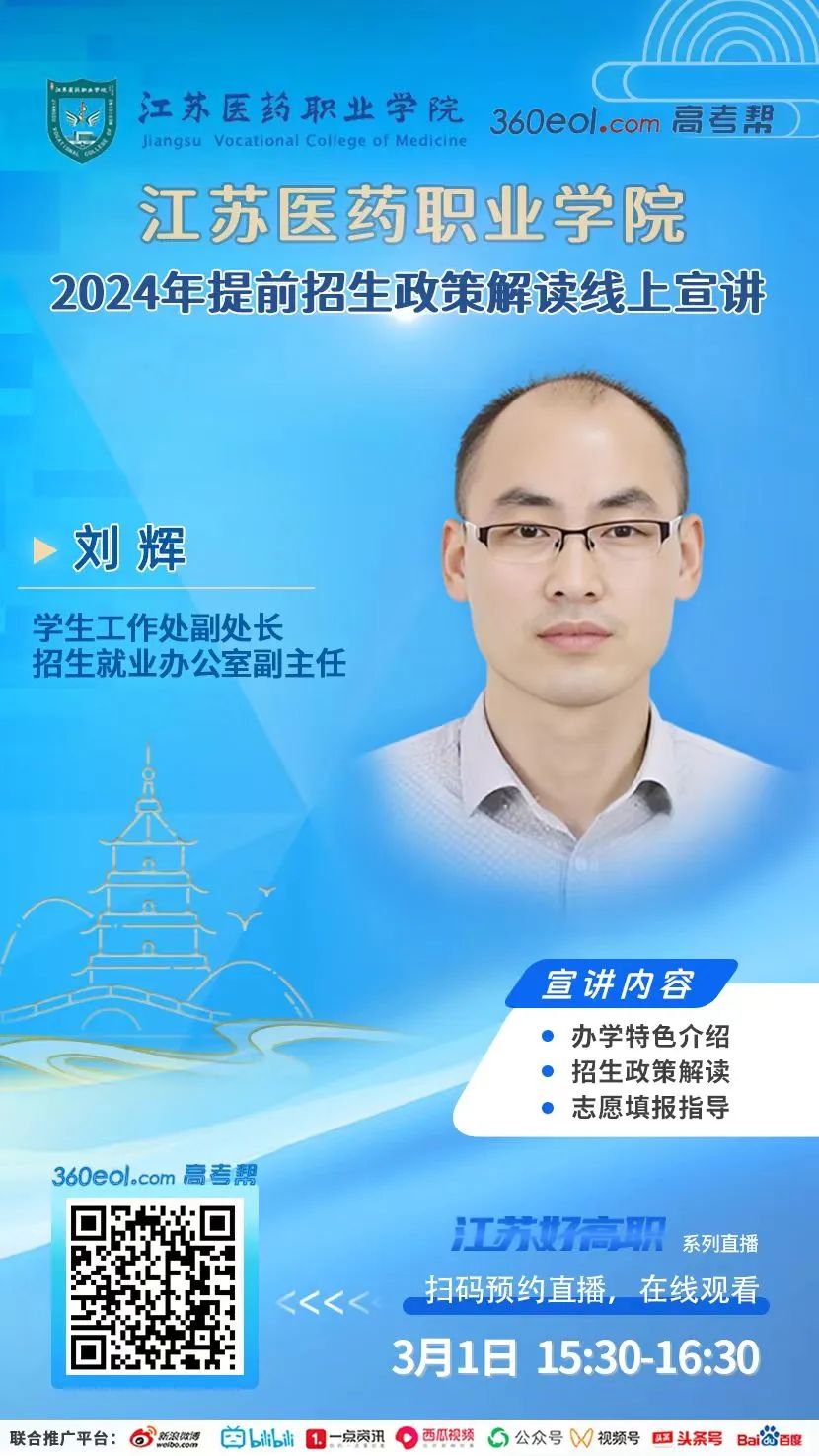 3月1日15:30–16:30江苏医药职业学院2024年提前招生线上直播,等你来看!