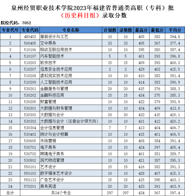 2023年泉州经贸职业技术学院福建省高职(专科)常规志愿批录取情况表