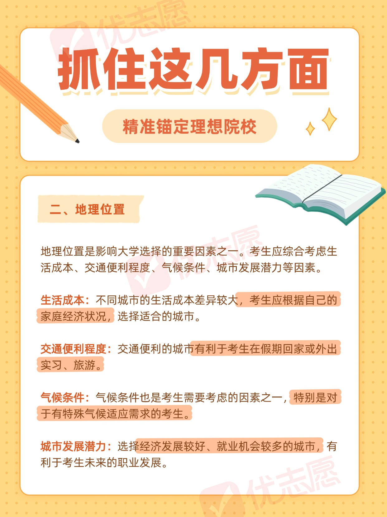 选择一所适合自己的大学对于个人的未来发展具有深远意义。为了确保自己能够进入理想的大学,高考生在选校过程中,需要从多个方面进行全面分析。下面是优志愿整理的高考志愿填报择校指南,一起了解!更多择校技巧,高考志愿填报干货、高考资讯,可以下载优志愿app进行查看~