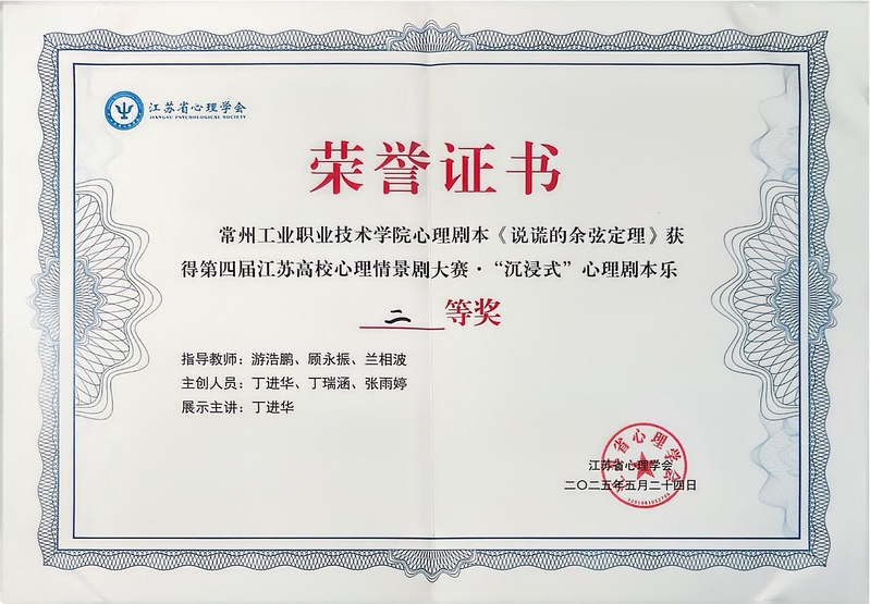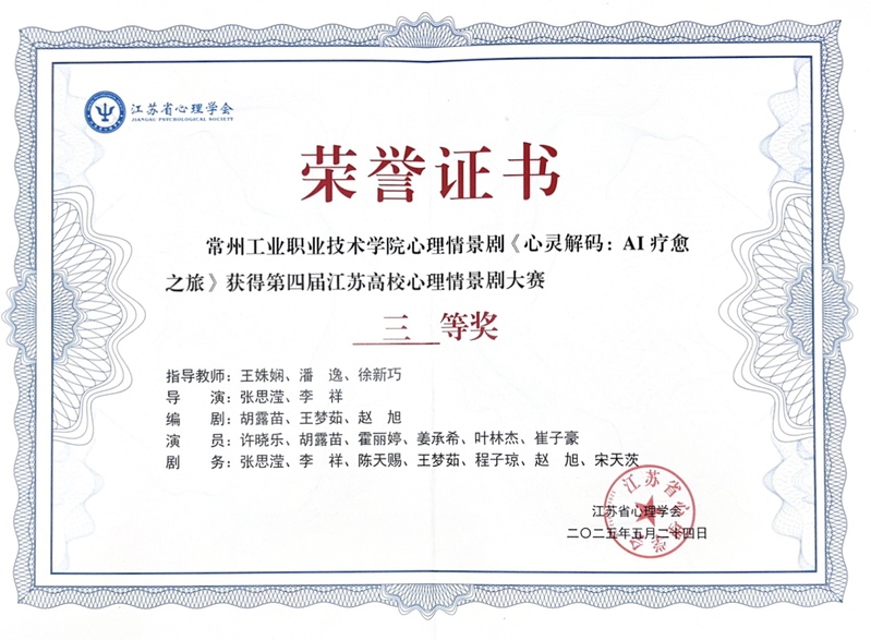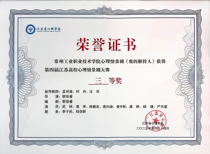 近日,由江苏省心理学会艺术心理辅导员与治疗专业委员会主办的第二届江苏省高校心理情景剧大赛决赛在盐城师范学院举行。由我校推荐的心理剧本《说谎的余弦定理》从全省97个参赛作品中脱颖而出,荣获二等奖;同时,学校推荐的心理情景剧作品《心灵解码:AI疗愈之旅》和《我的解铃人》也从全省140个参赛作品中脱颖而出,均荣获三等奖。游浩鹏、王姝娴、孟祥婕等9位老师被评为大赛优秀指导老师。