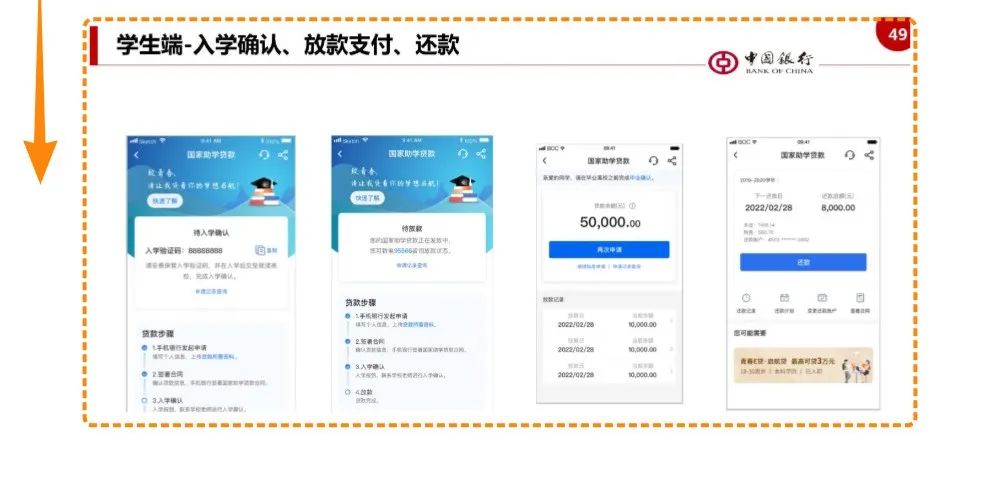 第8步:到高校报到后,将入学验证码提供给高校老师,由高校老师进入系统进行入学确认,入学确认后,中国银行将学费和住宿费部分直接放款至学生所在高校的对公账户,剩余贷款部分发放至学生本人中国银行个人账户(放款成功前不能销户)。