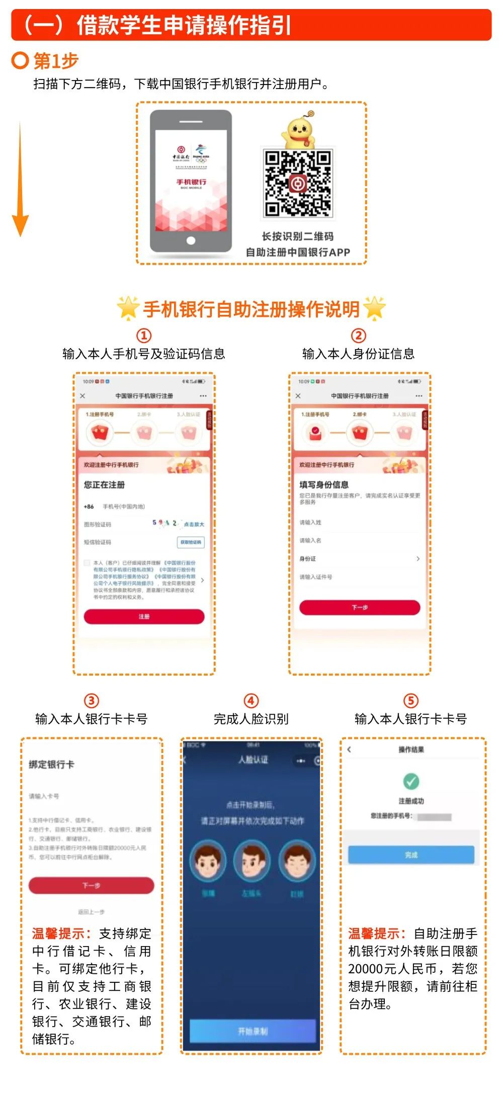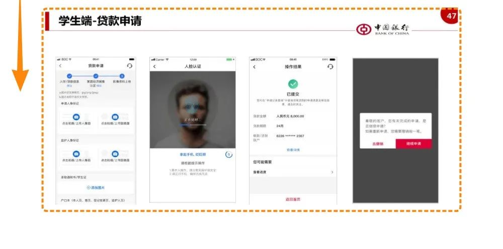 第6步:提交申请后,等待县级学生资助管理部门对学生的家庭经济困难情况进行审核,审核通过后,进入中国银行审批环节,中国银行审批通过后,会通过短信通知审批结果及入学验证码。审批通过后,学生可进入手机银行签署贷款合同。