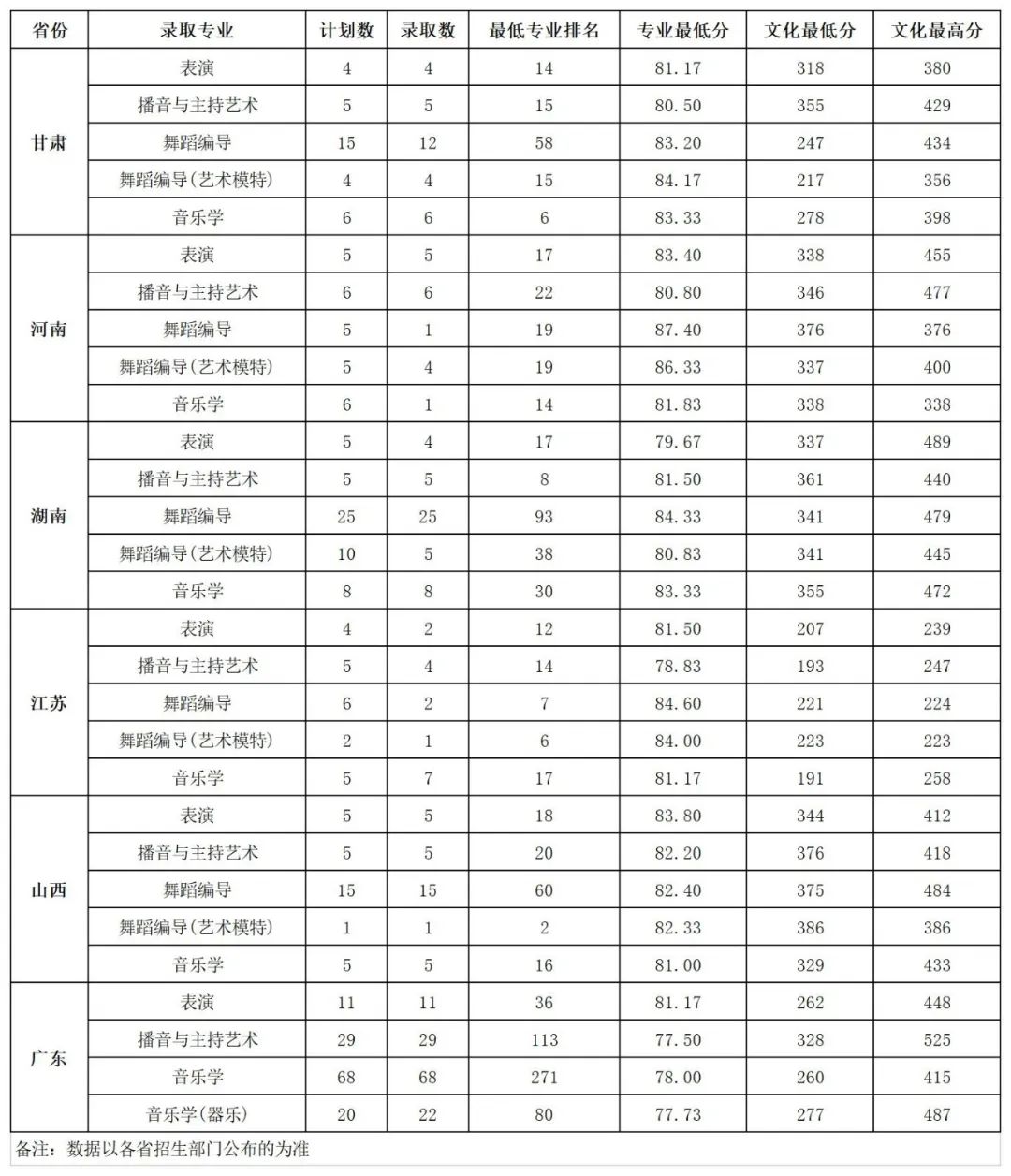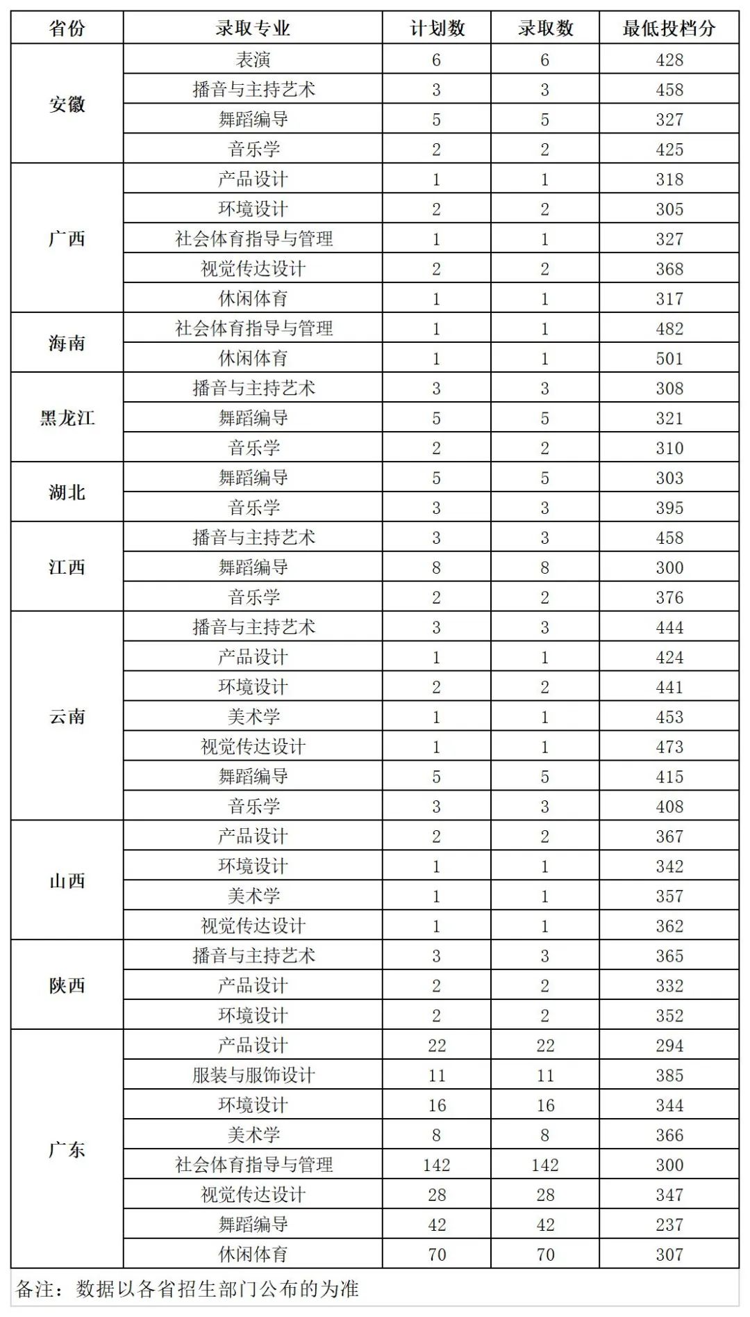 各省份2019年艺术类校考录取情况