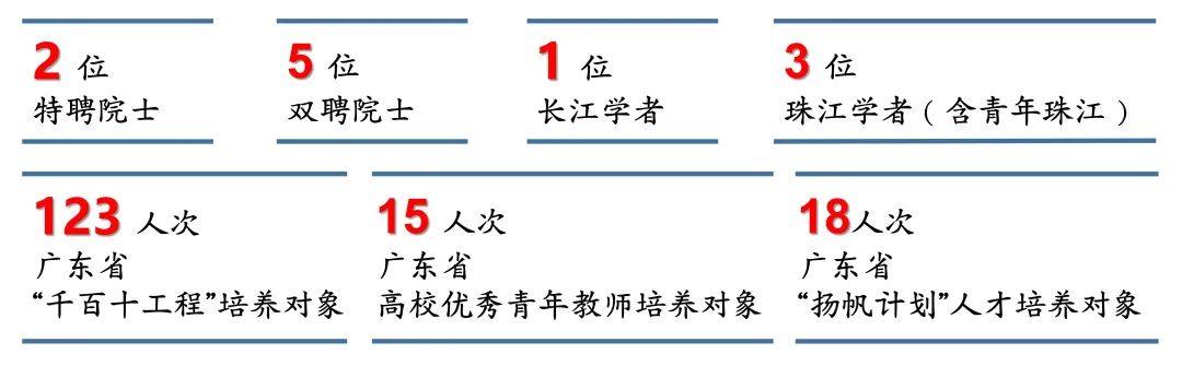学校现有教职工2061人,其中专任教师1464人、副高职称以上人员703人、博士学位者535人;博士生导师72人、硕士生导师339人;特聘院士2人;双聘院士5人;长江学者特聘教授1人;珠江学者特聘教授2人、青年珠江学者1人;123人次入选广东省高等学校“千百十工程”培养对象;15人入选广东省高等学校优秀青年教师培养对象、18人入选广东省“扬帆计划”人才培养对象。