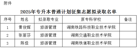 根据湖南省教育厅《关于做好2025年湖南省普通高等学校专升本考试招生工作的通知》(湘教发〔2024〕54号)及《湖南第一师范学院2025年普通专升本招生章程》相关规定,经省教育考试院审核通过,现将专升本普通类计划征集志愿拟录取学生名单公示如下。公示期为6月4日至6月10日。公示期间,如有异议,可以通过电话方式实名向我校反映。