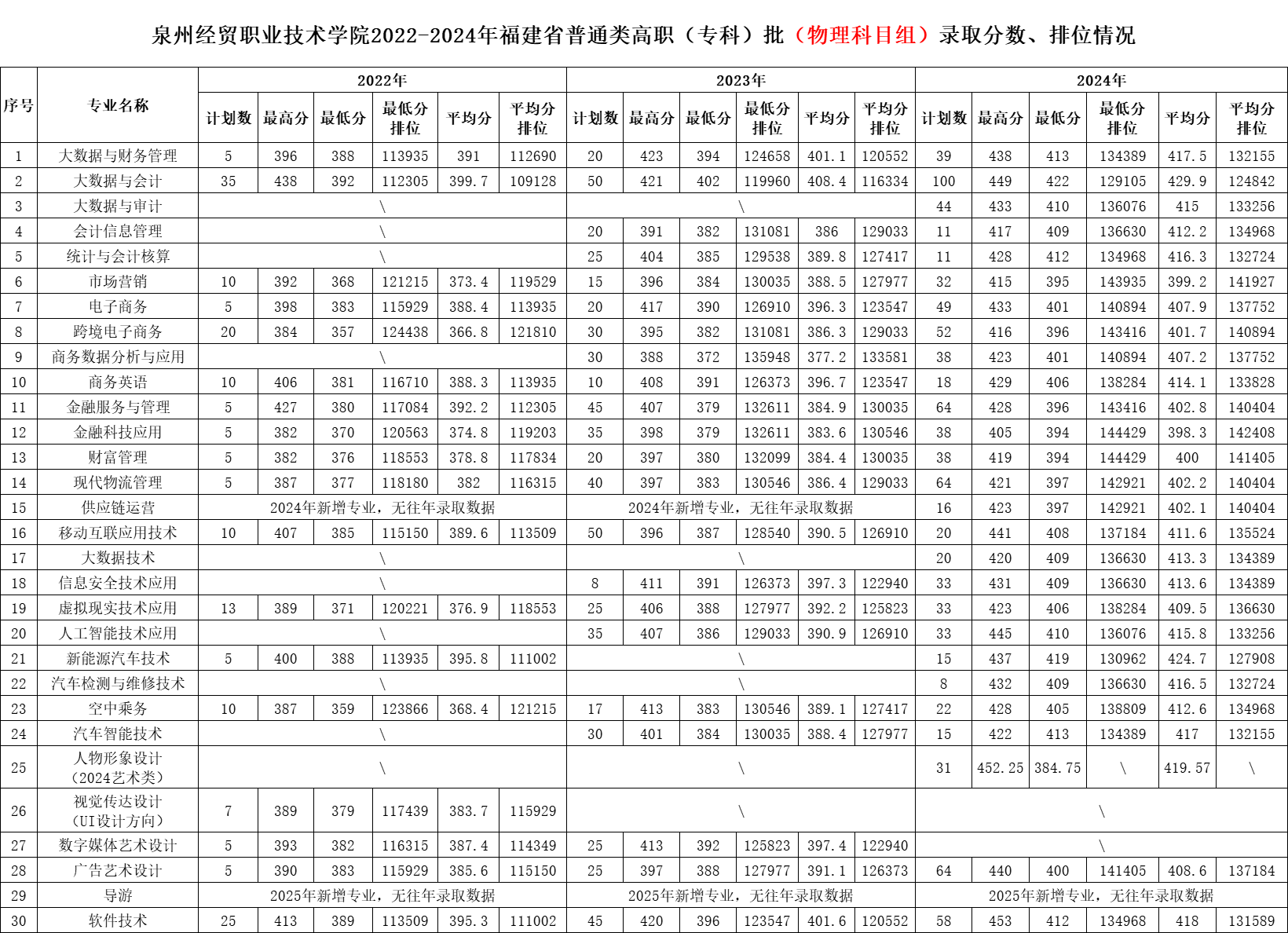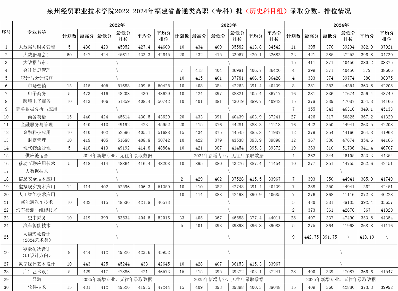泉州经贸职业技术学院2022-2024年福建省普通类高职(专科)批录取分数、排位情况