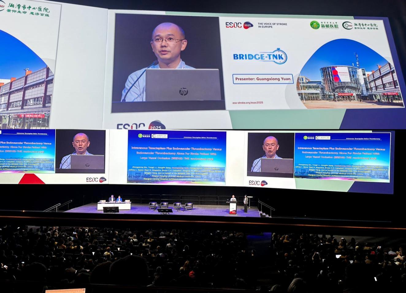 近日,第十一届欧洲卒中组织大会(ESOC 2025)在芬兰赫尔辛基举行。湘潭市中心医院(湖南大学附属医院)急诊科主任袁光雄教授团队在急性卒中救治领域取得的研究成果向全球发布,袁光雄和美国血管和神经介入病学主席Thanh N. Nguyen教授携手登上ESOC 2025开幕式主会场,并作为代表作大会报告。