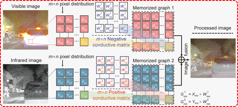 与此同时,我校物理与微电子科学学院邹旭明教授、信息科学与工程学院洪庆辉副教授、半导体学院廖蕾教授、香港理工大学柴扬教授及其合作团队面向自动驾驶复杂光环境感知需求,提出了一种视觉融合策略,通过异质结构介电层与沟道层的协同设计,使得视觉传感器实现近红外/可见光波段下非易失性正/负光响应,同时构建了面向自动驾驶的全电路仿真视觉系统。结合视觉融合策略与边缘提取电路设计,系统集成感知、融合、计算与决策功能,突破传统视觉感知的光谱局限性,在典型驾驶场景下目标识别精度高达99.0%,显著提升环境感知能力与驾驶安全性。