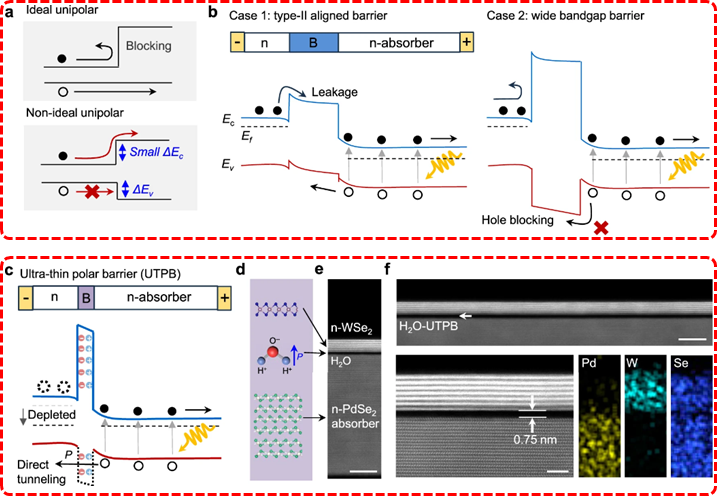 近日,我校物理与微电子科学学院邹旭明教授、吕亚威副教授、半导体学院廖蕾教授及其合作团队提出了一种超薄极性势垒(UTPB)策略,构建了亚纳米极化水插层的WSe2/H2O/PdSe2异质结探测器。该器件具有室温下不导电的暗态,微量光子入射即可迅速激活,展现出优异的宽谱红外响应性能,有望推动下一代红外探测器的发展。